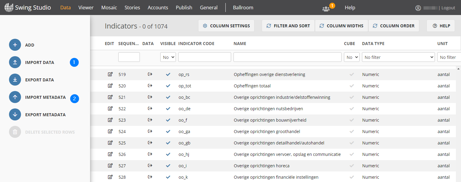 Het importeren van metadata is ook mogelijk op de pagina van het betreffende ondereel (Indicators, Units, Geolevels, etc. ). Zo gebruikt u bij het ondereel 'Indicators' de button 'Import metadata' (2) voor het importeren van metadata (van onderwerpen).