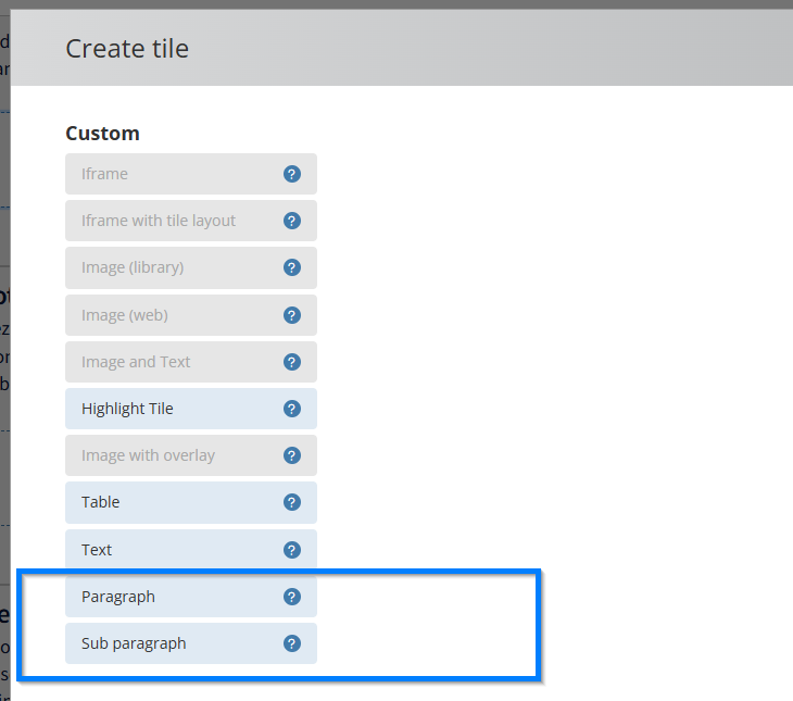 Een tegel met een afbeelding kan worden toegevoegd in een single of dual column section. Bij het maken van een nieuwe tegel staan aan de rechterkant de verschillende custom tegeltypes, waaronder vier opties voor een image tegel. De blauwe vraagtekens achter de namen leggen de verschillen tussen deze tegeltypes uit.